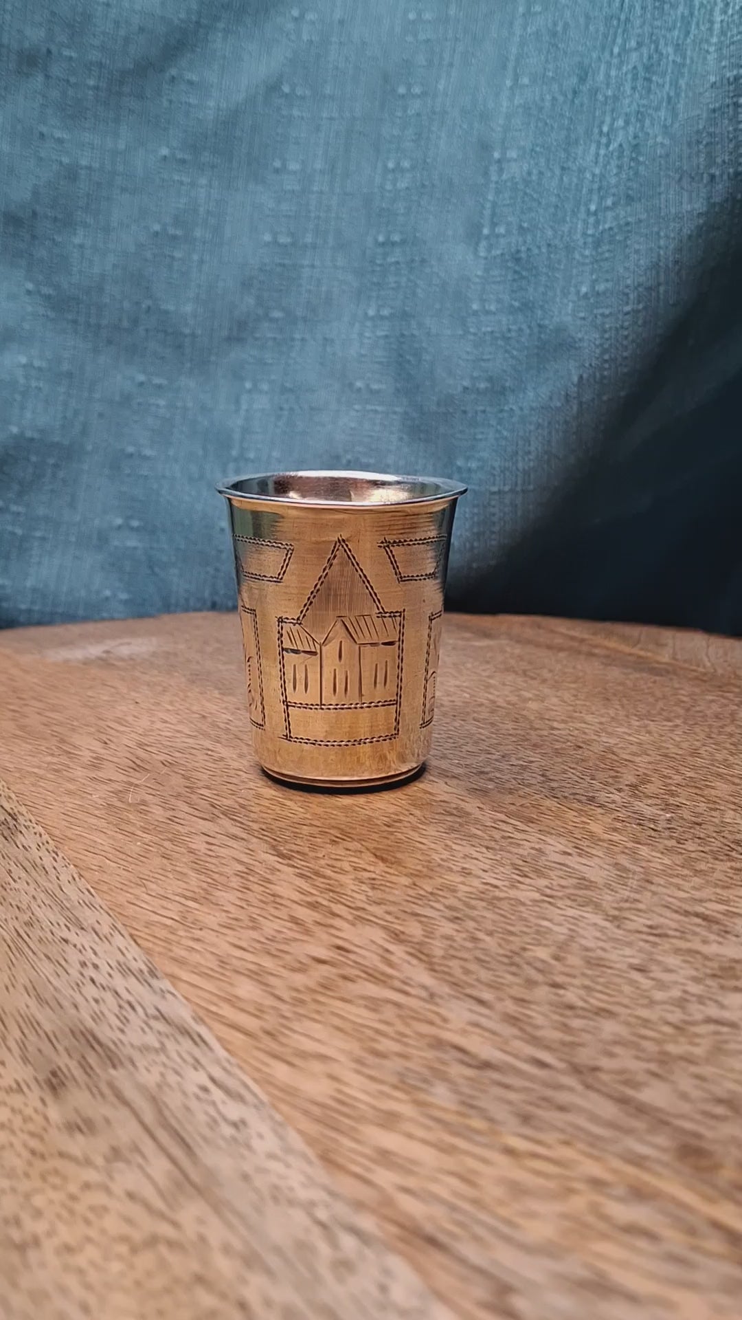 This exquisite antique kiddush cup is a fine example of late Imperial Russian silver craftsmanship. The cup features a tapered, beaker-like form with a slightly flared rim and a stable flat base. The exterior is intricately hand-engraved with a combination of architectural and floral motifs: stylized buildings resembling towers or cityscapes (possibly evoking Eastern European or Jerusalem-inspired structures common in Judaica), framed by zigzag borders and dotted chain-like patterns, alongside elegant leaf and feather-like floral elements for added decorative depth. The engravings show skilled chasing and etching techniques, with shaded hatching for texture and dimension. The interior retains its original gold gilding, which provides a luxurious contrast to the silver exterior and helps prevent tarnishing from acidic liquids like wine. The cup's design reflects the Art Nouveau influences emerging in the late 1890s, blending traditional motifs with subtle modernism.
